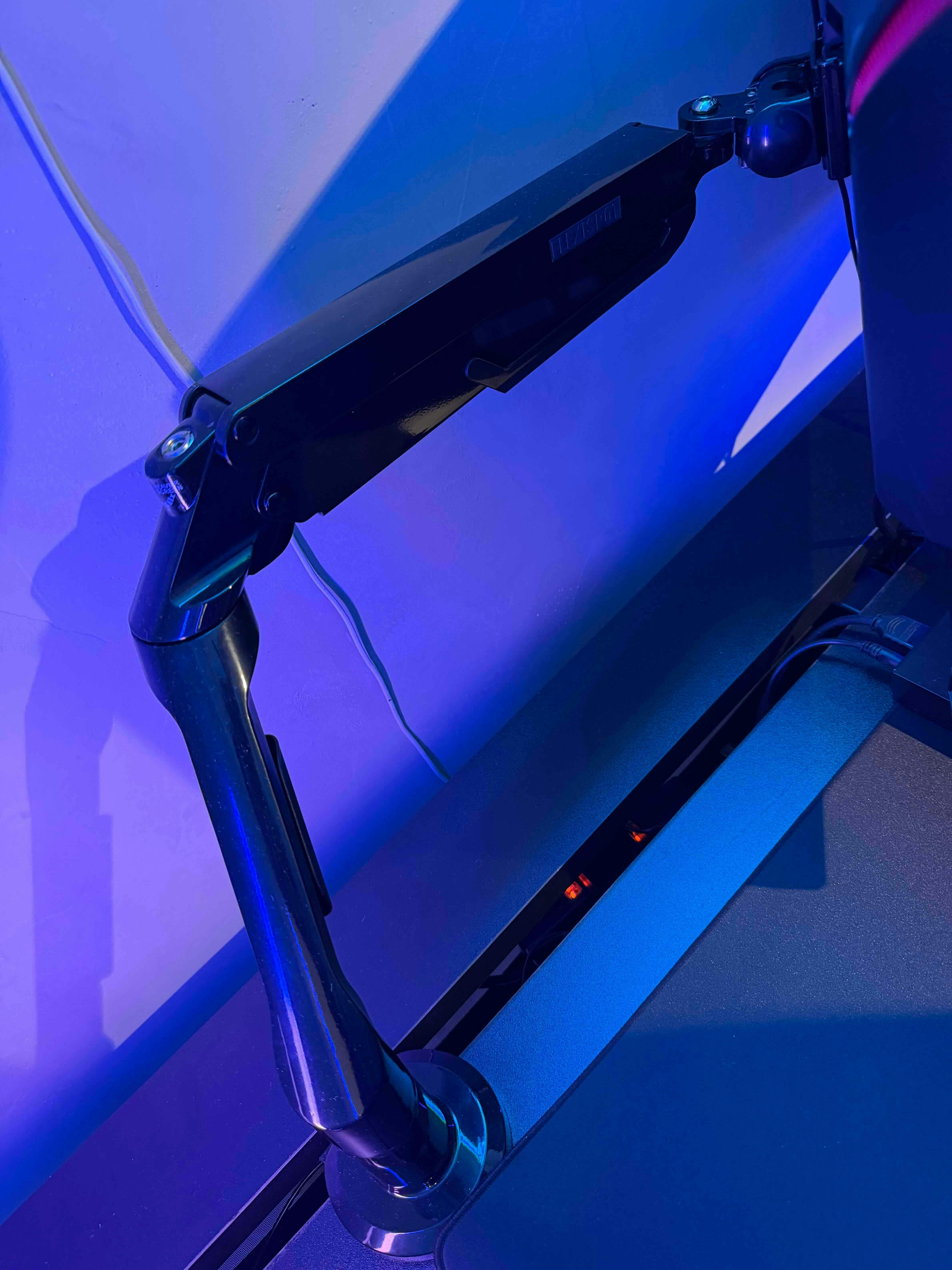 - Patented free-installation clamp, ideal for a variety of thick desktops Gas spring hovering system gracefully adjusts monitor height.