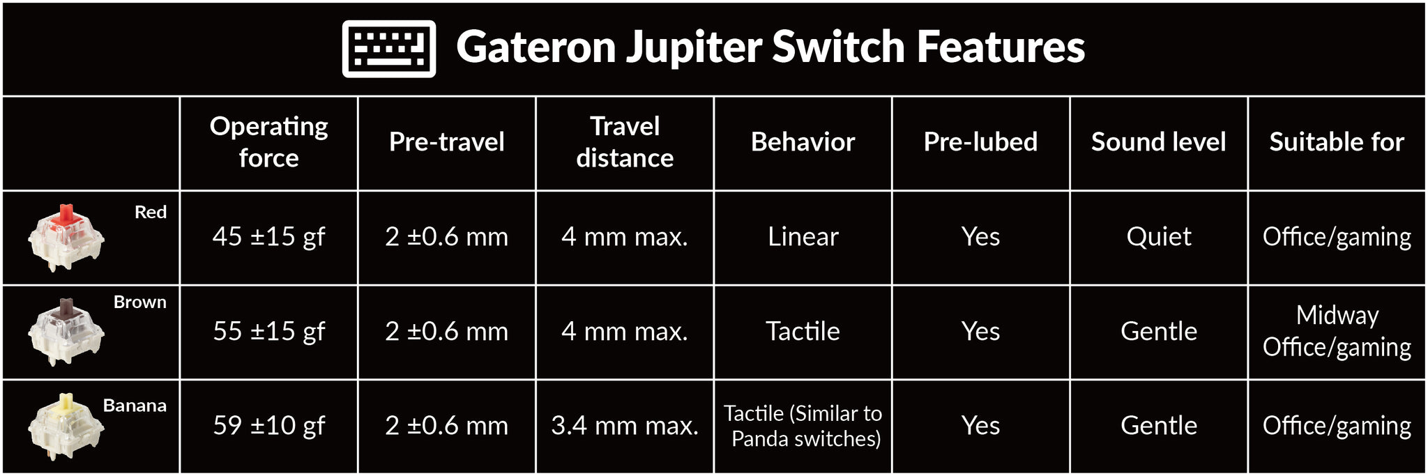 Our exclusive Gateron Jupiter mechanical switch (for the Fully Assembled version only) comes with a 3-pin design, its pre-lubed with a reliable Gateron quality standard with up to 80 million keystrokes lifespan. While their unique LED diffuser design offers high RGB backlight transmittance and softer backlight effect.The banana switch provides an early tactile bump at the top with a uniquely smooth experience like those Panda switches on the market.